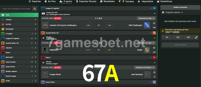 O 67A oferece uma grande seleção de opções de apostas em e-sports com probabilidades competitivas